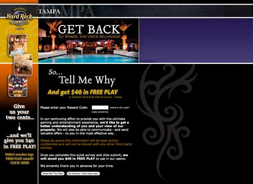 McCartney produces survey coding for GA Wright Client Seminole Hard Rock We are pleased to announce that we recently completed a very successful survey campaign for the Hard Rock Hotel & Casino Tampa working under G.A. Wright Marketing Inc. of Denver, Colorado. We created a comprehensive survey system with a personalized free offer to survey respondents. The campaign has been a great success and it was a real pleasure to work with Peter, Rick, Rich, Ivy and a great team over at G.A. Wright.