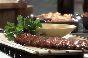 It's grilling season - get yer butt outdoors (unless you live in Phoenix!) Ruth's Nod to Tony Roma's Baby Back Ribs Ingredients: 2 slabs baby back ribs (about 3 pounds) Kosher salt and freshly ground black pepper Extra-virgin olive oil 2 bacon slices 4 sprigs fresh thyme 1/2 onion 3 smashed garlic cloves 2 cups ketchup 4 dashes Tabasco 1 cup peach or apricot jam 2 tablespoons Dijon mustard or 1 tablespoon dry mustard 2 tablespoons brown sugar 1/4 cup molasses 2 tablespoons red or white wine vinegar 1 teaspoon ground cumin 1 teaspoon ground paprika Special equipment: Kitchen twine