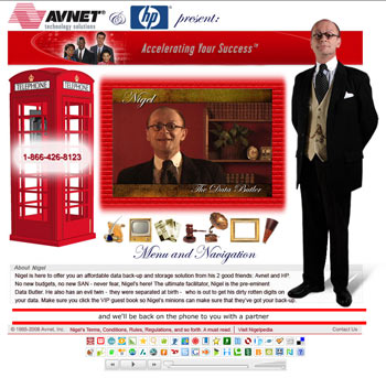 Introducing: Nigel The Data ButlerYour Data is served... McCartney developed an off-brand personality in "Nigel The Data Butler" for Avnet (AVT) and Hewlett Packard (HP). The goal was to create an online personality to sell back up and storage services for the IT industry. By creating an online campaign that is original and fun, we had to put our thinking caps on tightly to raise the bar. After a deep search for creative answers, we found that storage services require a fine sense of expertise just like a? Butler! There, that's how the idea was born. Now what would the character look like, what would he sound like? What was the sales pitch that would get people to accept and opt-in for the services of our esteemed clients ? Find out, when you go to: http://www.nigelthedatabutler.com and don't forget to visit parody site NigelPedia.com to learn more about our hero and his evil twin Dastardly Derek the Data Dodger.