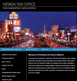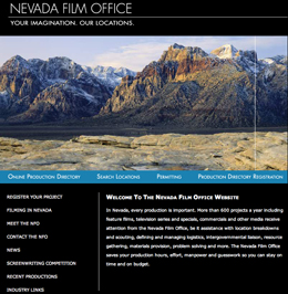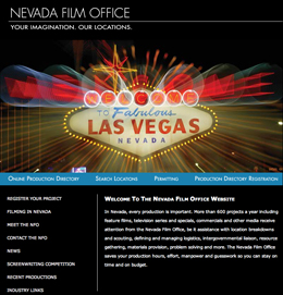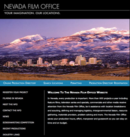 Nevada Film.comCharlie Geocaris and his team once again turned to Chez McCartney to create a fresh look for the site at NevadaFilm.com, as well as an extensive custom software engine, which allows the NVFO Staff to manage ad. revenue, manage listings, banners, content, PR, newsletters, databases and so on. Well-done Jessica, Jerry, Christian, Amit and the crew.
