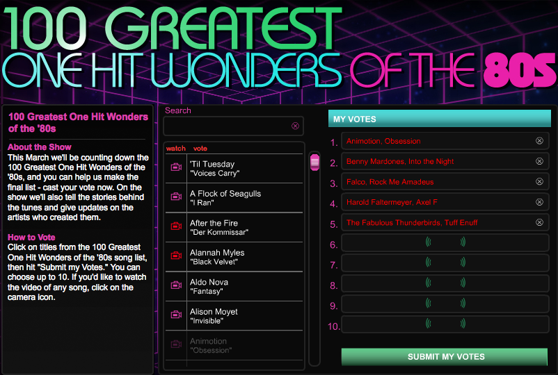 McCartney clients and friends included are Benny Mardones and his hit "Into the Night" as well as Animotion's "Obsession" and The Fabulous Thunderbirds ' "Tuff Enough". Our friends from across the pond are also nominated - Harold Faltermeyer's "Axel F" and Falco's "Amadeus". You can vote as many times as you want. http://www.vh1.com/shows/the_greatest/one_hit_wonders/